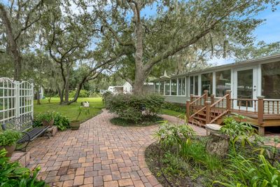 Outside, brick paver walkways wind through landscaped gardens shaded by mature trees. At the back of the home, a deck and patio create inviting spaces for morning coffee, entertaining friends, or simply enjoying the peaceful surroundings.
